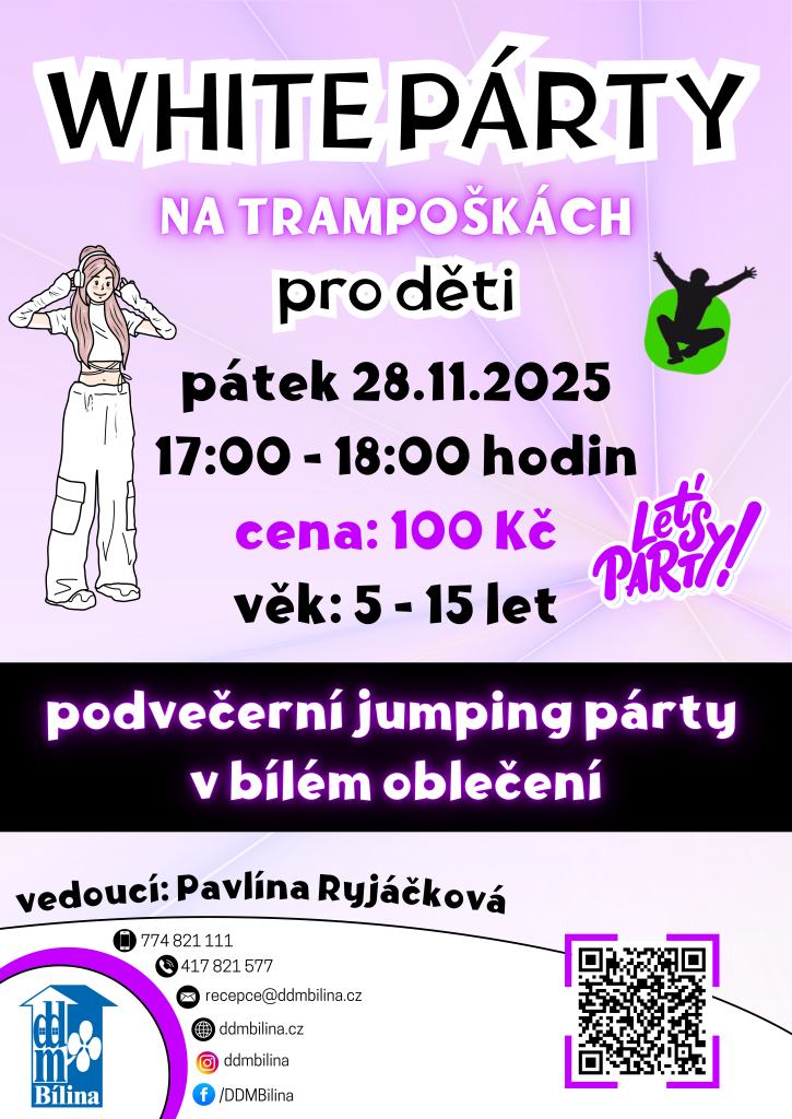 Podvečerní jumping párty v bílém oblečení. Párty hudba, UV světla a světelná show. S sebou pití, čistou sportovní obuv a hlavně dobrou náladu!