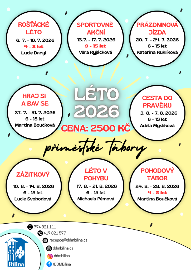 Letošní rok jsme pro vás připravili 8 příměstských táborů, na letáčku níže naleznete jejich termíny a názvy včetně hlavního vedoucího tábora.