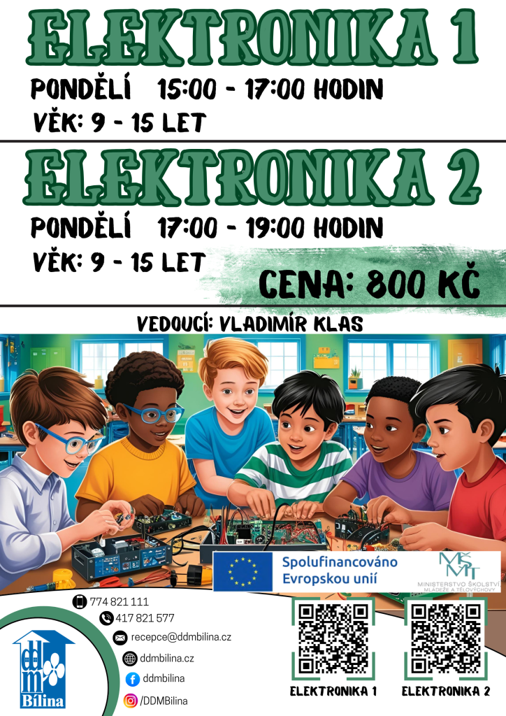Zajímá tě, jak fungují některé věci? V kroužku Elektronika se naučíš vyrobit jednoduché přístroje jako je alarm, zvonek nebo různé funkční motůrky. Poznáš, jak fungují některé součástky, vyzkoušíš si pájení, cínování a naučíš se orientovat v elektrických obvodech.